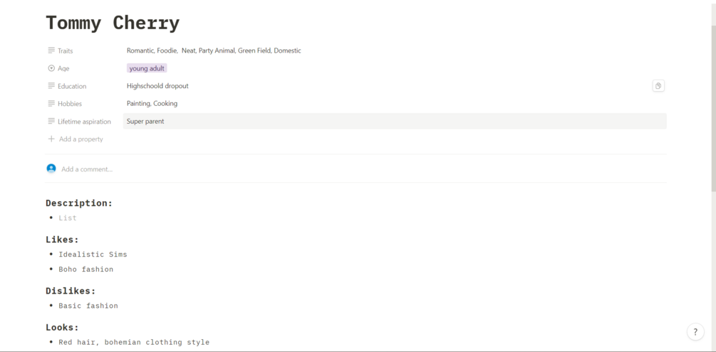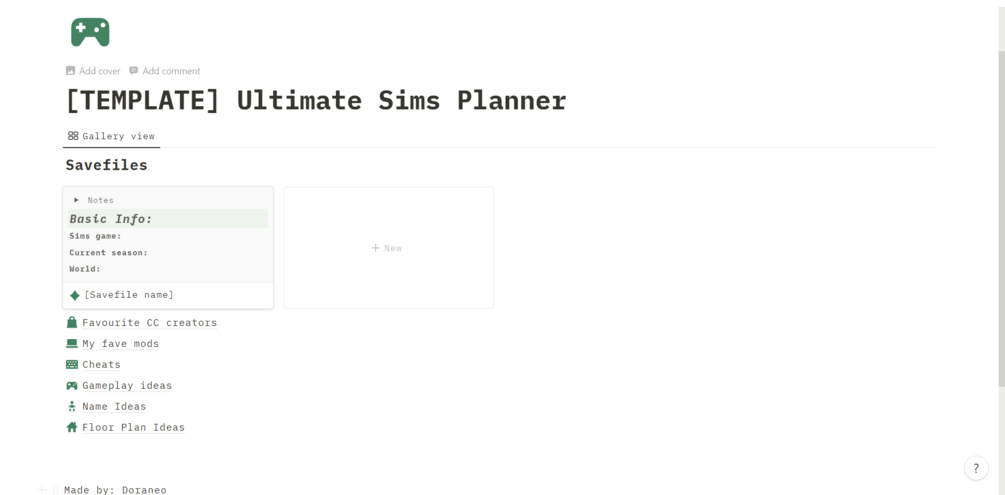 Introducing the Ultimate Sims Planner Notion Template, designed for Sims 2, 3, or 4 enthusiasts. This comprehensive planner allows you to meticulously document essential details about your save files, including in-depth information about households. Each individual can have a detailed description, and there's even a daily schedule included.Navigate through each save file page effortlessly, enhanced with a calendar section to note holidays, events, birthdays, and more. Organize your favorite CC (Custom Content) creators with dedicated pages, complete with links to their profiles. Similarly, manage your mods efficiently with designated pages and corresponding links.Explore additional sections such as cheats, gameplay ideas, and pages dedicated to name and floor plan ideas. Elevate your Sims gaming experience with this all-encompassing Notion template, streamlining the way you plan, organize, and enjoy every aspect of your virtual world.